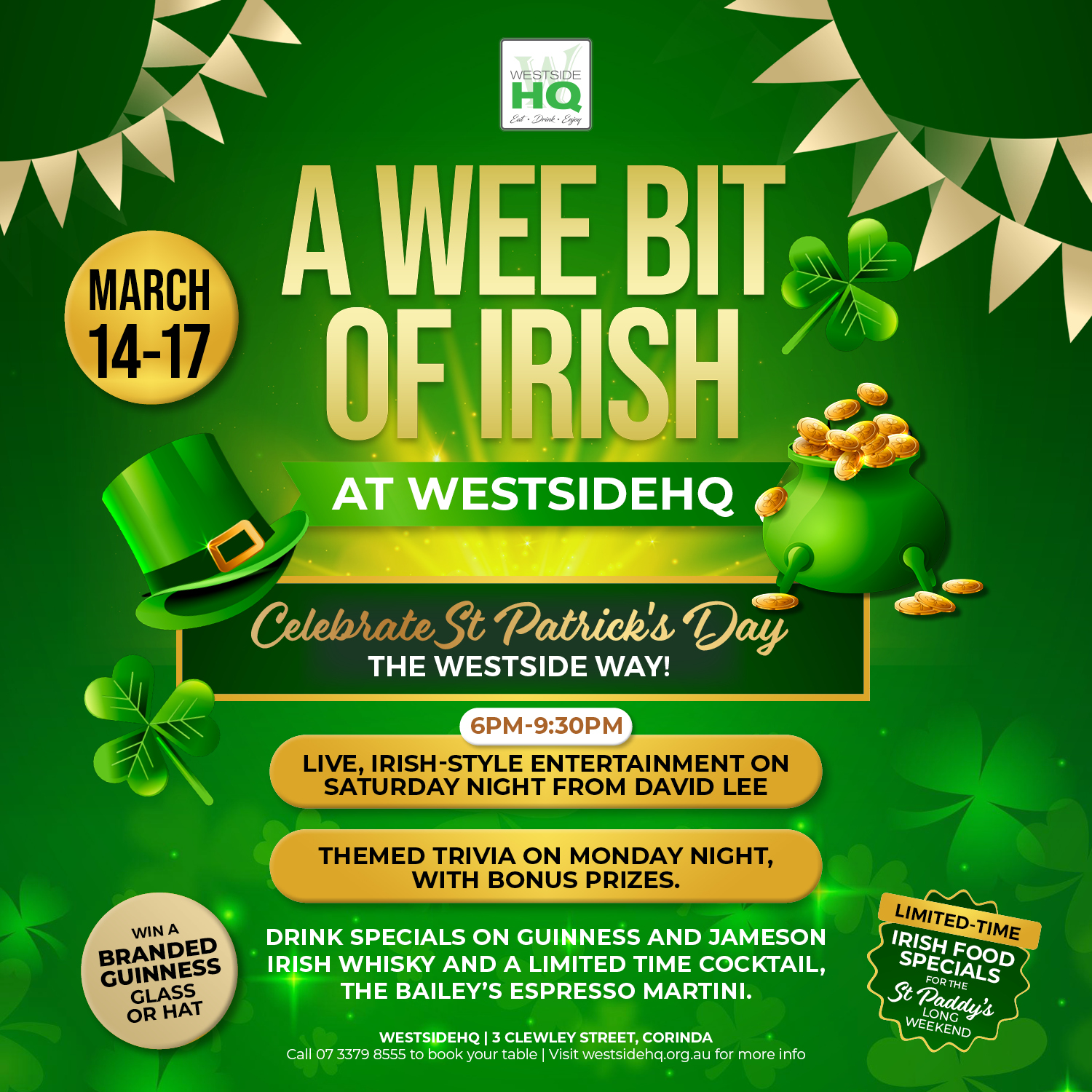 🧠 Monday 16th – Irish-themed trivia with Question Mark’s Trivia at 6.30pm (register from 6pm)